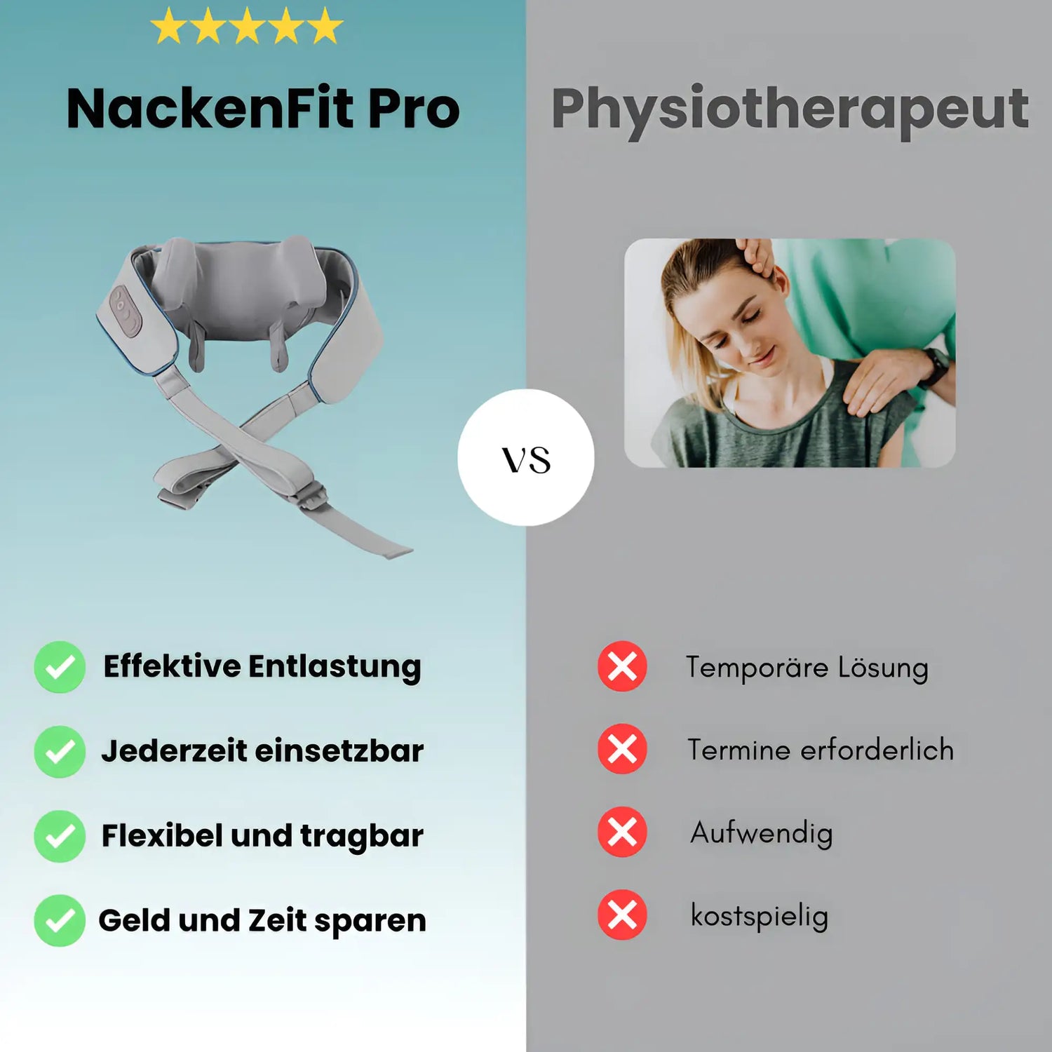 Stell dir vor, keine wöchentlichen Termine mehr beim Physiotherapeuten, keine hohen Rechnungen. Stattdessen hast du mit dem NackenFit Pro jederzeit eine entspannende Massage direkt bei dir zu Hause. Keine Wartezeiten, keine Anfahrt, nur tiefenwirksame Entspannung auf Knopfdruck.